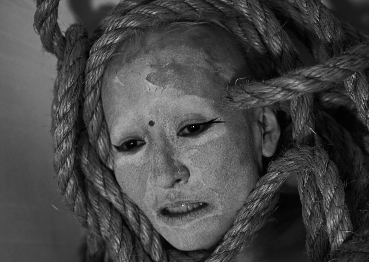 Amid shades of Beckett, we meet a creature – androgynous in many ways – in a powdered mask, trapped in a claustrophobic space undergoing some form of evolution or metamorphosis involving a rope that encompasses her floor and at time her only reality.