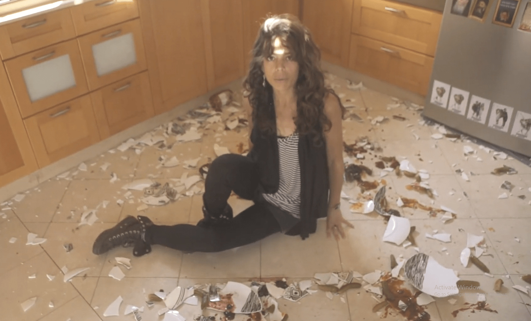 Bring Love is shot in a kitchen. It opens with a female character consuming pickles with jam and jelly. There are enough plates on the table to serve many. Next, we see the female character asleep on the kitchen floor among many broken dishes. She seemingly wakes up from a nightmare and proceeds to break more dishes that are in the sink as opposed to washing them. She begins to speak poetry over ambient sounds and a heavy bass set to Middle Eastern melody. Amid the chaos, we repeatedly hear the words, “bringing love back from the brink of extinction”. We see falling and breaking plates reverse course through special effects to become whole again.