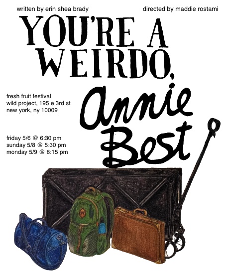 “You’re a Weirdo, Annie Best” by Erin Shea Brady is produced by Juliet Roll in association with the Fresh Fruit Festival (Covid Compliance overseen by Leah Ableson) and will run Friday 5/6 at 6:30 pm; Sunday 5/8 at 5:30 pm; Monday 5/9 at 8:15 pm.