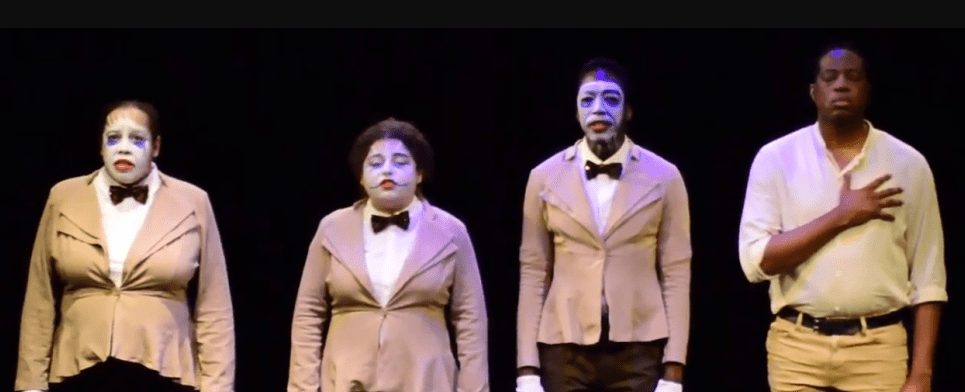 Drawing on American theatre traditions, particularly Vaudeville, silent films and minstrel shows, Black, played mutely and unstoppably by Duane Ferguson, keeps the audience riveted with his every glance and movement, shocking the theatre in his final scene, when he utters his only lines of the one-hour play, “I can’t breathe.” His poignant responsiveness to the situations he is put through is humanized greatly by the musical chorus that follows him on his journey (played by Alexandra Doering-Dorvial, Kofi Mills and Gigi Principe, in full minstrel whiteface), harkening, a Capella, traditional and modern African American tunes to ground the audience in each episodic time.
