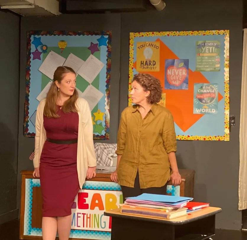 This emotionally – wrenching play is set in a well-maintained 5th grade classroom. Only two people grace the stage during the entire 85-minute performance: the teacher, played by Laura King Otazo and the mother of a child who was suspended and has come unexpectedly for a suspension conference, played by Nicola Bertram. The visit is unexpected by the teacher since, over the weekend, the child killed himself. The teacher is caught off-guard, but the mother is not to be put off. She wants to know WHY her child was suspended, convinced that it is directly related to his suicide. The teacher, Heather, cites school policy, suggests a better time, etc. but the mother, Corryn, will not leave. She wants ANSWERS and Heather has them.