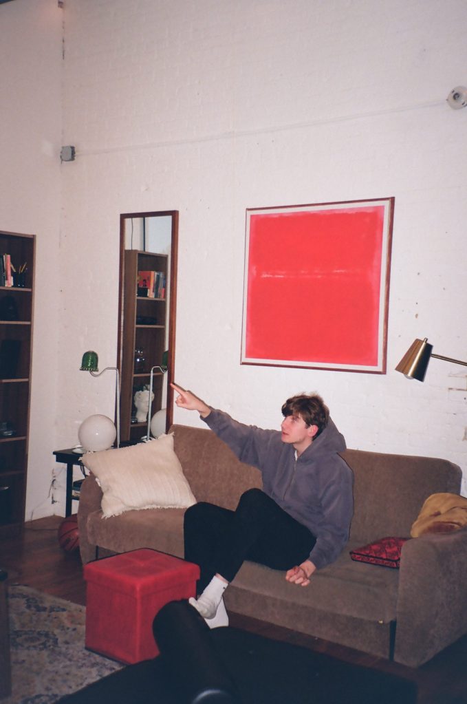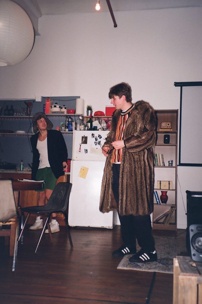 Untitled, 1970 is the story of best friends Tristan (writer and producer Styrmir Elí) and Joey (Charlie Jordan). The two European artists have moved into an apartment on Locust Street in Bushwick—and the play is performed in that very apartment. Every scene that takes place in their spacious living room/kitchen is witnessed live by the audience, who are sitting on comfy couches and chairs just a few feet away from them. The refrigerator where Tristan and Joey get their drinks is the same one that is available to the audience to imbibe beer and seltzer from (during intermission of course). The restroom of the “theater” is the apartment’s actual bathroom, also utilized (vividly) by the characters during the play. And anything that takes place outside of the main room of their apartment is shown on a large screen to the right of the kitchen—we see the pair leave the apartment through the real front door, then we witness their outdoor activities on film; and then they return to us live once more to continue their story.