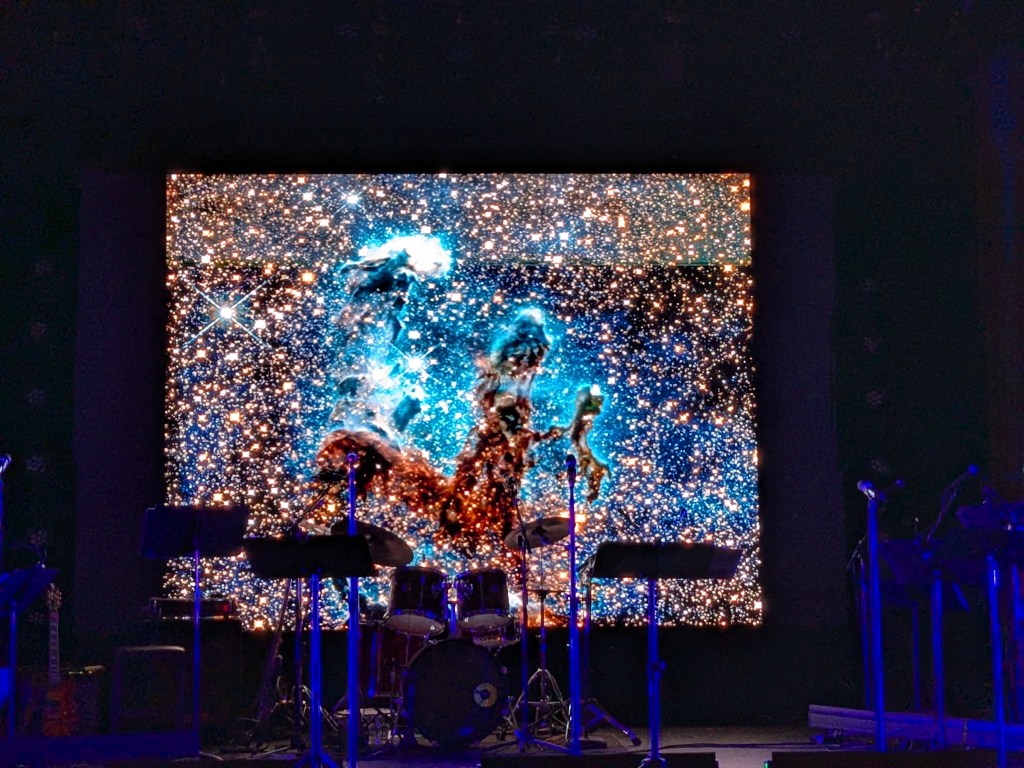 Before it even starts, there are videos of space projected behind the stage, constantly changing. Then comes the music – loud rock, with lyrics that are easy to understand (sometimes on the screen). During the course of the performance, the videos display – more space pictures; beautiful pictures of life on earth – animals moving, plants growing; and some bright-colored designs reminiscent of Peter Max.