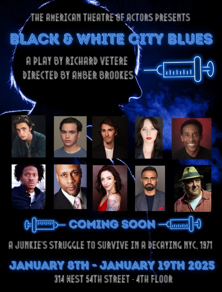 The American Theatre of Actors opens its 49th season with Black & White City Blues A young junkie, heroin, Brooklyn, 1971. January 8 — 19, 2025 at the American Theatre of Actors, 314 West 54th Street, New York City