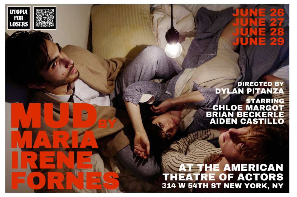 Maria Irene Fornes’ MUD is one of the those shows that you can imagine being done very poorly or very well. Luckily the production done at ATA, directed by Dylan Pitanza was excellent. Chloe Margot as Mae gives a wonderfully sexualized performance as the woman child who wants more (an education, an escape, to be loved), but has probably been used from a very young age as a sexual object by first her father and then her “brother”, Lloyd, both of whom, relied on her to bring most or all the income into the farm, do all the work and satisfy their needs. Brain Beckerle’s “Lloyd” is man who was forever damaged by being told that he had no brains and no future and feared everything in life. He has no way to express himself other than violence. Aiden Castillo’s “Henry” is the ne’re do well who puts on “airs” to portray himself as educated and successful but only manipulated himself into position to destroy the little bit of life that Mae and Lloyd had before he inserted himself into their lives.